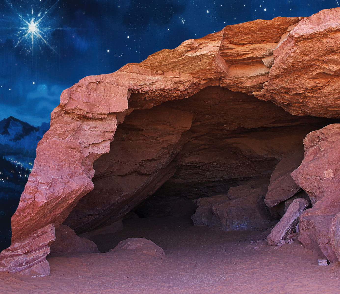 Panoramiczny baner przedstawiający realistyczną grotę betlejemską wkomponowaną w piękny, nocny krajobraz. Ciepłe barwy naturalnych skał kontrastują z chłodnym, gwiaździstym niebem oraz świetlistą betlejemską gwiazdą, tworząc wyjątkową atmosferę oczekiwania na Narodzenie Pańskie. Idealny jako tło do szopek bożonarodzeniowych, dekoracji kościelnych i przestrzeni liturgicznych — nadaje scenie głębi, uroku i podniosłego charakteru.