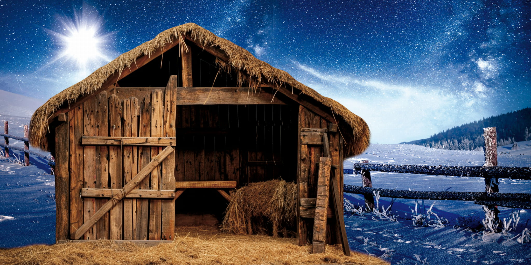 Panoramiczny baner bożonarodzeniowy przedstawiający piękną, drewnianą stajenkę osadzoną w zimowym krajobrazie pod rozgwieżdżonym niebem. Jasna betlejemska gwiazda rozświetla całą scenę, tworząc wyjątkowy, świąteczny klimat. Realistyczne detale drewna, siana i ośnieżonego ogrodzenia sprawiają, że dekoracja doskonale nadaje się do kościołów, szopek parafialnych oraz przestrzeni liturgicznych, wprowadzając ciepło i atmosferę oczekiwania na Narodzenie Pańskie.