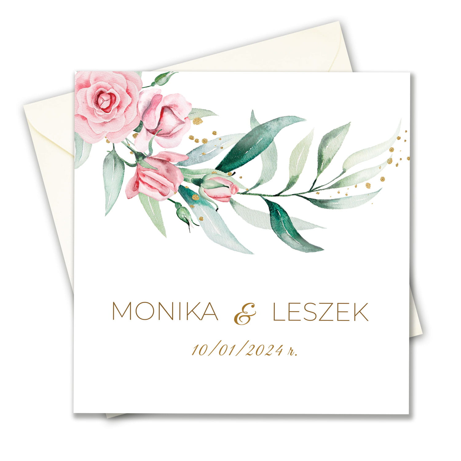 Rozmiar zaproszenia po złożeniu: 15 x 15 cm.