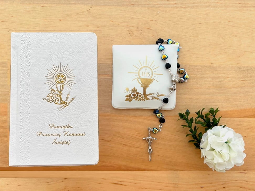 Świętuj Pierwszą Komunię Świętą z naszym eleganckim zestawem, który zawiera książeczkę, różaniec i etui.