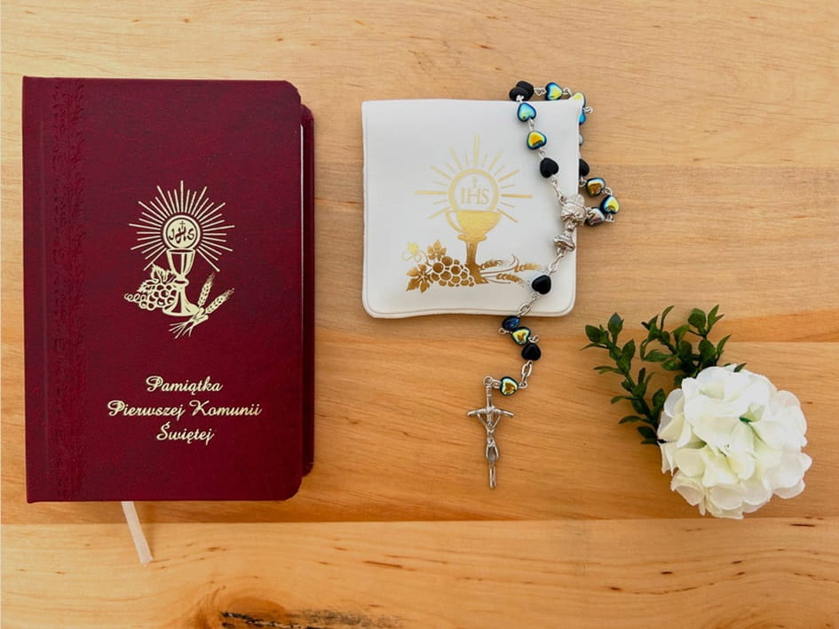 Świętuj Pierwszą Komunię Świętą z naszym eleganckim zestawem, który zawiera książeczkę, różaniec i etui.