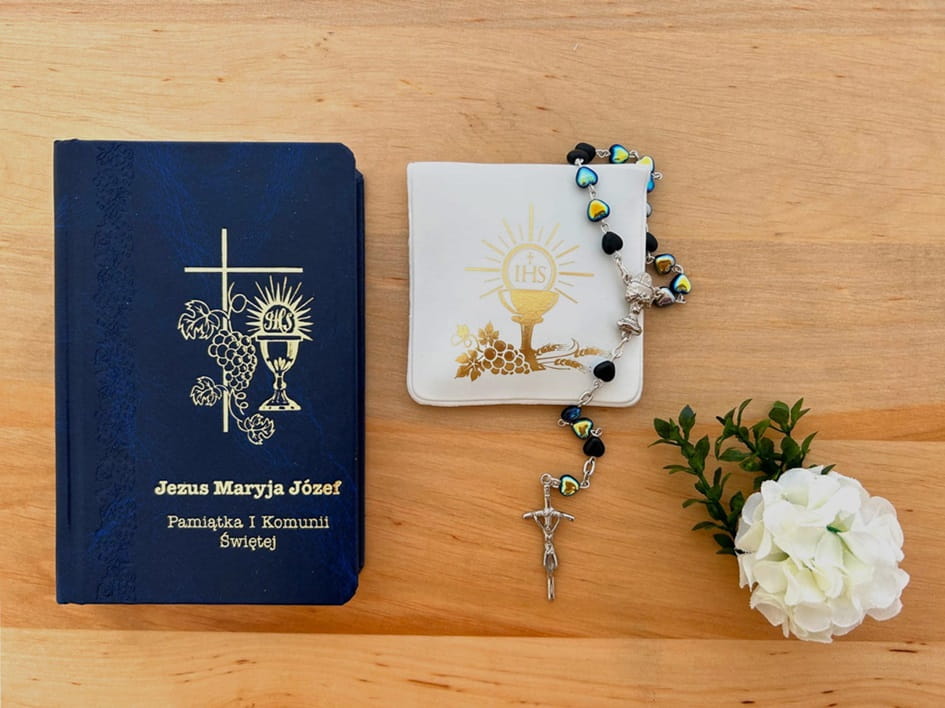 Świętuj Pierwszą Komunię Świętą z naszym eleganckim zestawem, który zawiera książeczkę, różaniec i etui.
