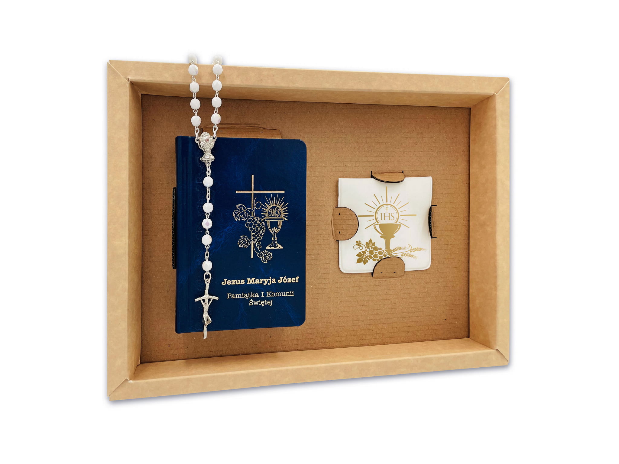 Świętuj Pierwszą Komunię Świętą z naszym eleganckim zestawem, który zawiera książeczkę, różaniec i etui.