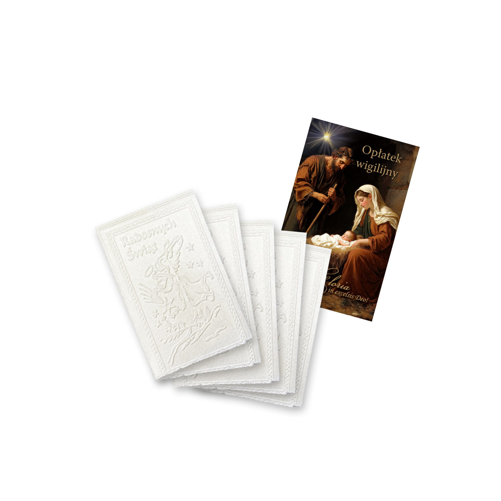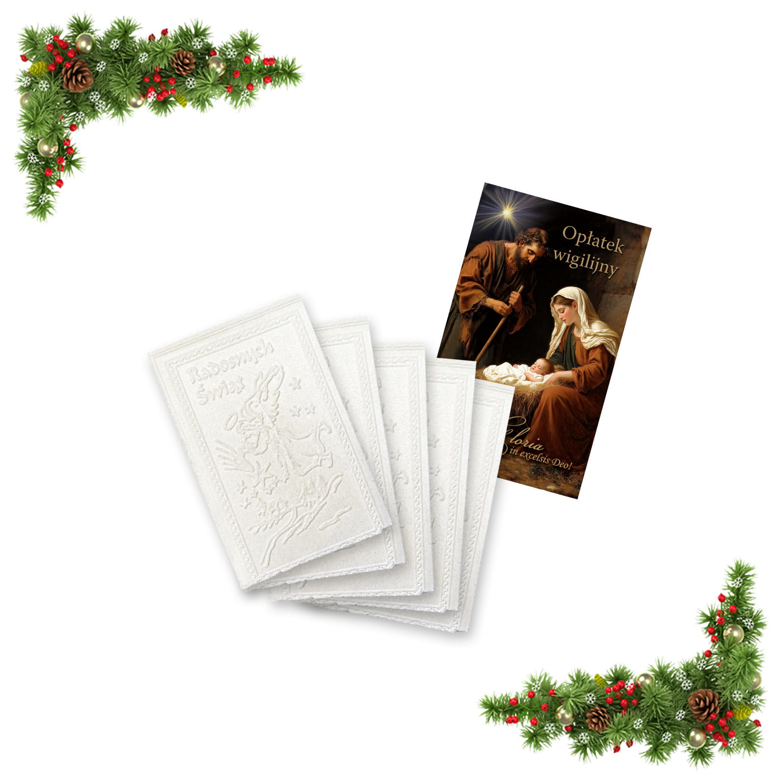 - 5 małych opłatków 6x10 cm, które możesz ofiarować tym, którzy nie mogą być z Tobą w Wigilię (np. sąsiadom lub bliskim)