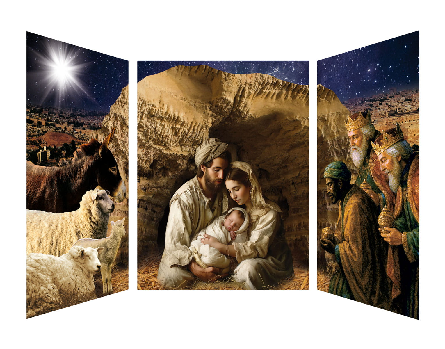 Zestaw trzech banerów przedstawiających pełną ciepła i realizmu scenę Bożego Narodzenia. Centralny baner ukazuje Świętą Rodzinę w Betlejem, a boczne skrzydła dopełniają kompozycję wizerunkami Trzech Króli oraz zwierząt pasterskich. Nasycone kolory, wysoka jakość druku i pięknie odwzorowane detale sprawiają, że banery idealnie nadają się do dekoracji kościołów, kaplic, sal parafialnych oraz szopek bożonarodzeniowych.