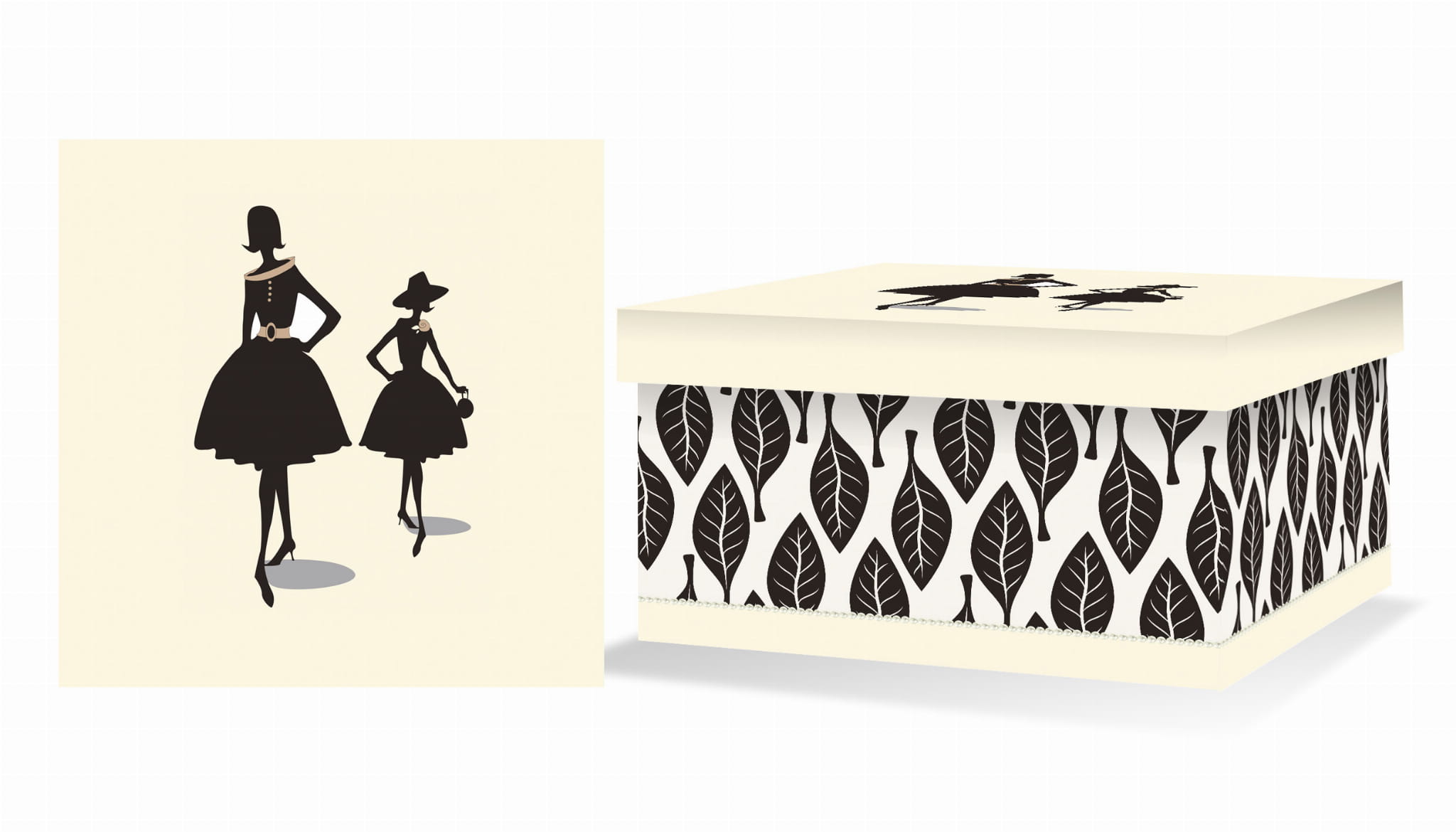Pudełka ozdobne z subtelnym beżowo - czarnym kolorem. Boki pudełka ozdobione motywem czarnych liści, na wieczku pudełka znajduje się grafika-zarys dwóch kobiet. Produkt wykonany z wysokiej jakości tektury 1mm, warstwa zewnętrzna okryta okleiną i folią matową, która wpływa na trwałość oraz wytrzymałość pudełka. Pudełka nie rysują się i przez długi czas pozostają w nienagannym stanie. Poszczególne pudełka ozdobne znajdujące się w zestawie bardzo dobrze sprawdzą się jako artykuł do przechowywania rzeczy, a piękna szata graficzna sprawi, że pudełka ozdobne idealnie sprawdzą się jako element dekoracji wnętrza, a także opakowanie na wyjątkowy prezent dla najbliższych.