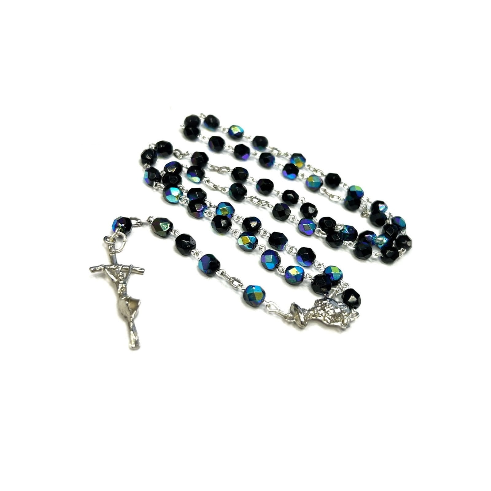 Różaniec komunijny - granatowy - opal - kryształ - łącznik IHS