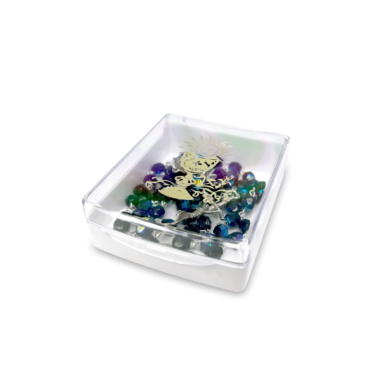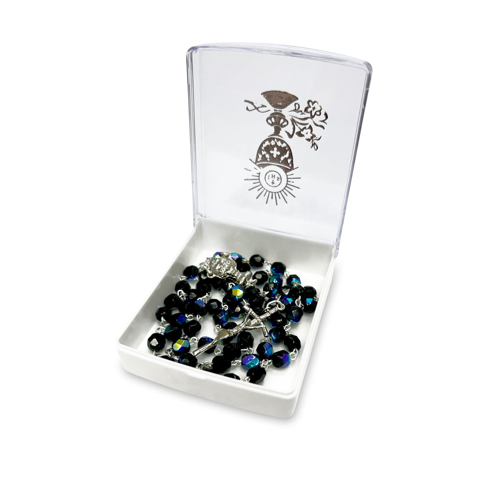 Różaniec komunijny - granatowy - opal - kryształowe koraliki - łącznik IHS + etui