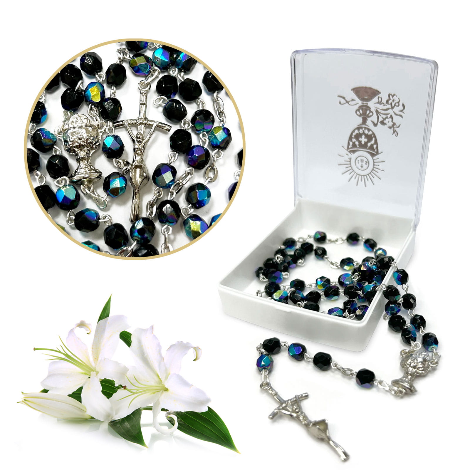 Pierwsza Komunia Święta to bardzo ważna uroczystość dla wszystkich wiernych, nie tylko dzieci które po raz pierwszy będą uczestniczyć w pełni Sakramentu Eucharystii. Nieodłącznym elementem tej pięknej chwili jest różaniec. Produkt, który Państwu proponujemy idealnie sprawdzi się jako pamiątka na lata, przypominająca o tym ważnym momencie w życiu. Różaniec pierwszokomunijny stworzony został z plastiku i dostępny jest w dwóch wersjach kolorystycznych, białej i czarnej. Dostępny na naszej stronie różaniec pierwszokomunijny będzie wspaniałym prezentem, zwieńczającym tę podniosła chwilę w życiu młodego katolika.