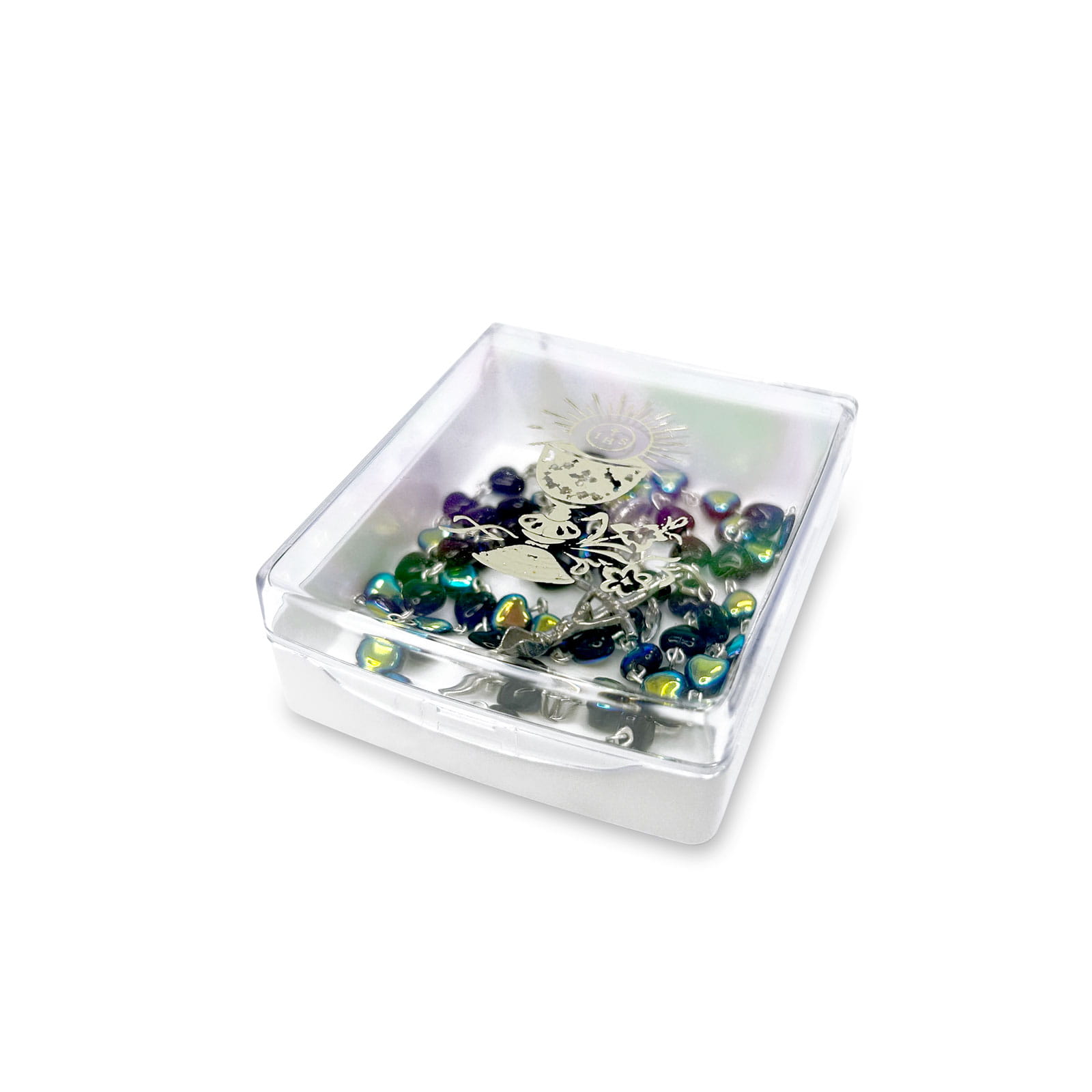 Paciorki w różańcu są opalizowane.
