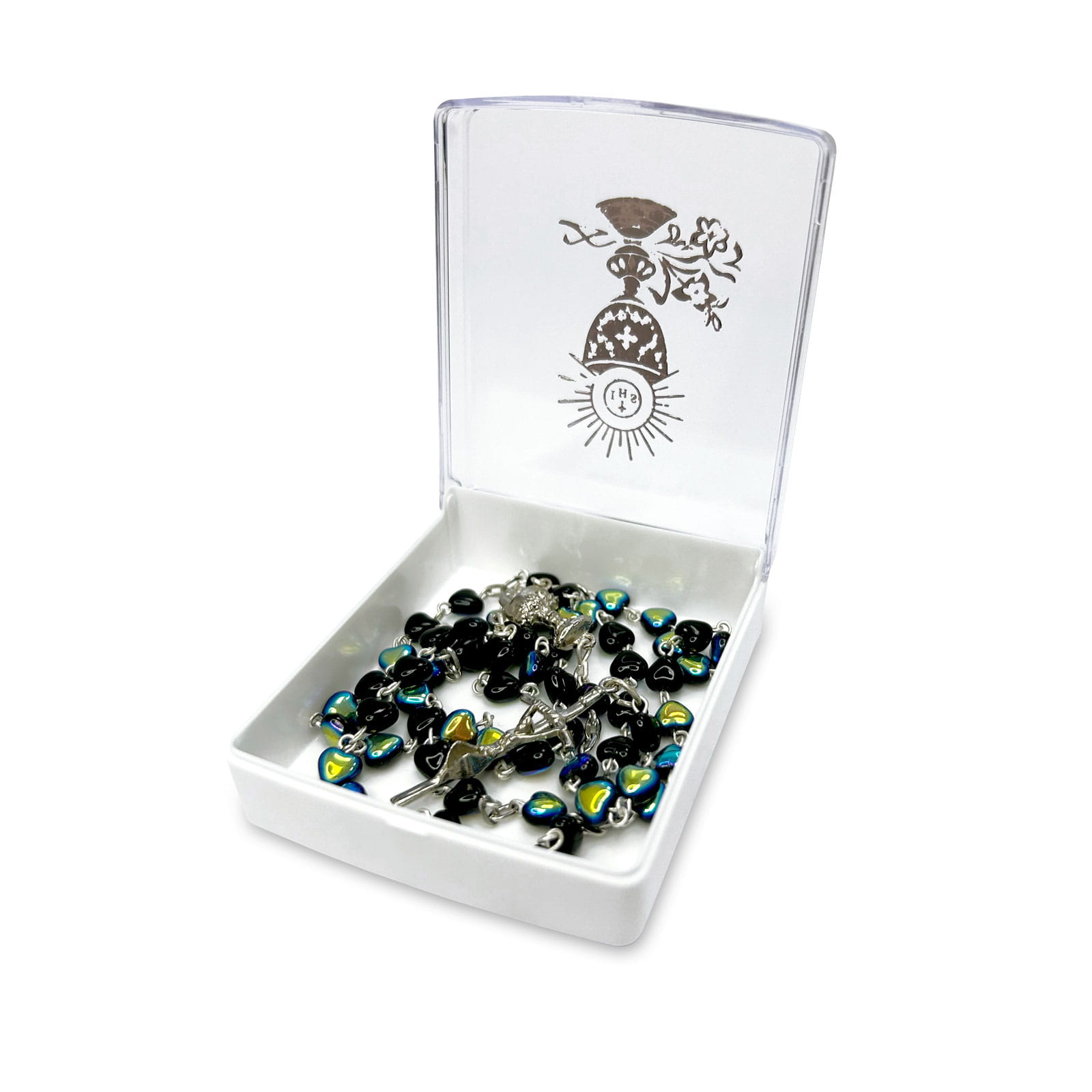 Różaniec komunijny - granatowy - opal - serca - łącznik IHS