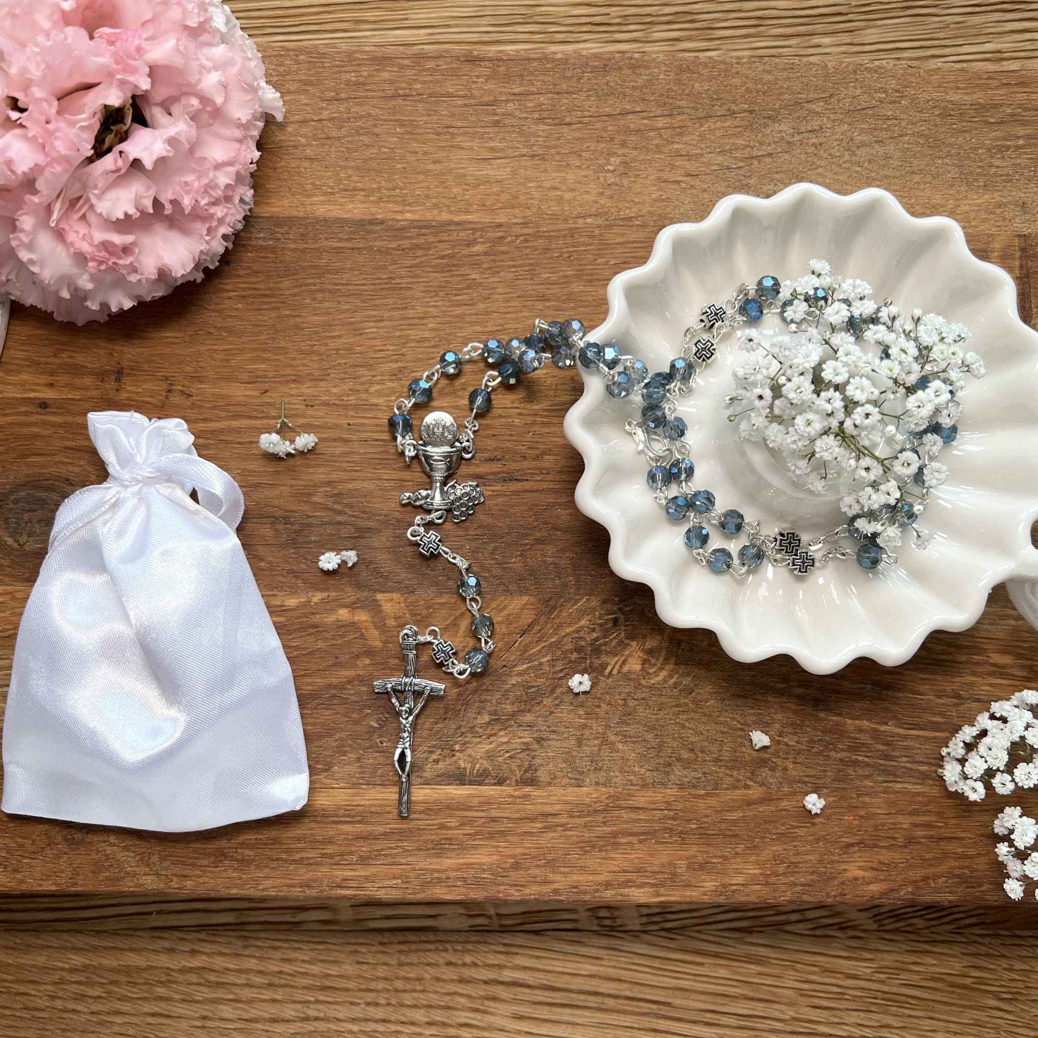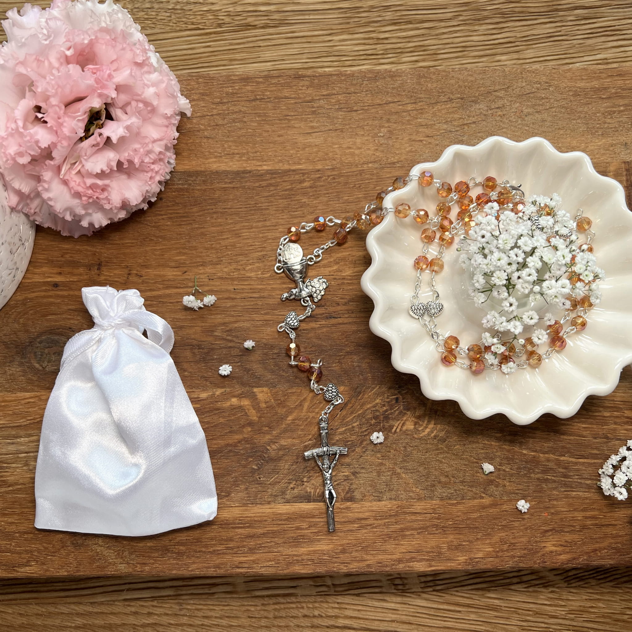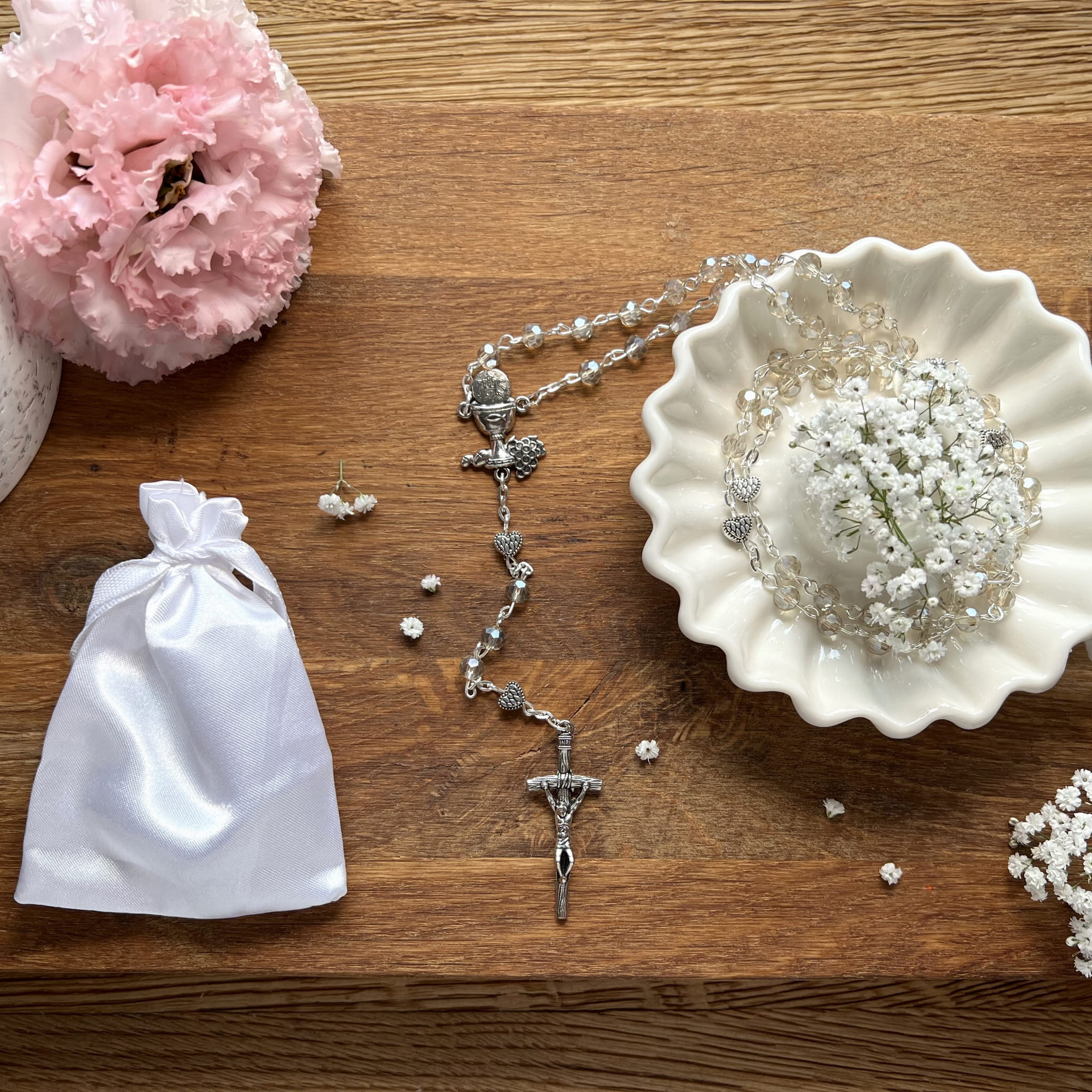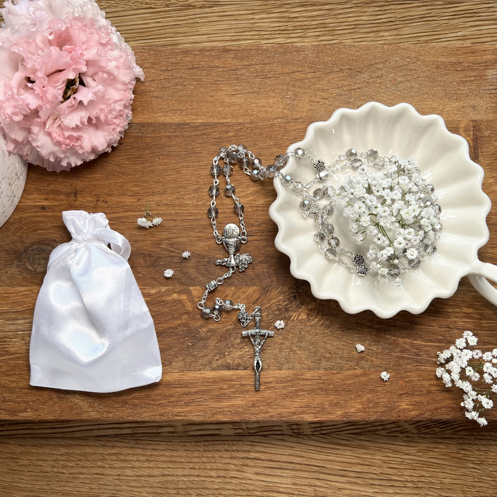 Pierwsza Komunia Święta to bardzo ważna uroczystość dla wszystkich wiernych, nie tylko dzieci które po raz pierwszy będą uczestniczyć w pełni Sakramentu Eucharystii. Nieodłącznym elementem tej pięknej chwili jest różaniec. Produkt, który Państwu proponujemy idealnie sprawdzi się jako pamiątka na lata, przypominająca o tym ważnym momencie w życiu. Dostępny na naszej stronie różaniec pierwszokomunijny będzie wspaniałym prezentem, zwieńczającym tę podniosła chwilę w życiu młodego katolika.