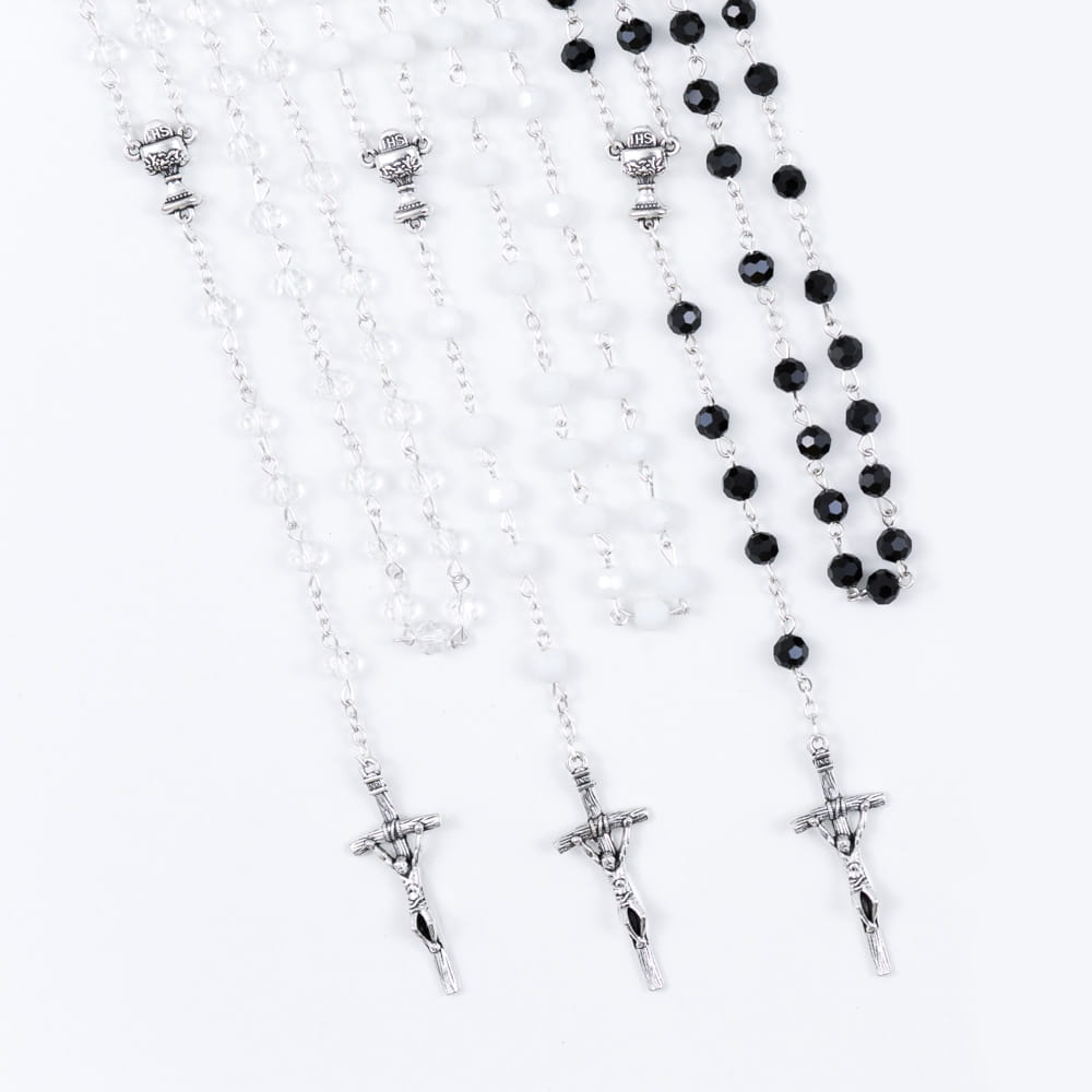 Pierwsza Komunia Święta to bardzo ważna uroczystość dla wszystkich wiernych, nie tylko dzieci które po raz pierwszy będą uczestniczyć w pełni Sakramentu Eucharystii. Nieodłącznym elementem tej pięknej chwili jest różaniec. Produkt, który Państwu proponujemy idealnie sprawdzi się jako pamiątka na lata, przypominająca o tym ważnym momencie w życiu. Różaniec pierwszokomunijny stworzony został z kryształu i dostępny jest w trzech wersjach kolorystycznych, białej, przezroczystej i czarnej. Medalik-łącznik przedstawia Kielich mszalny z Hostią, będący symbolem odwołującym się do Sakramentu Eucharystii. Dostępny na naszej stronie różaniec pierwszokomunijny będzie wspaniałym prezentem, zwieńczającym tę podniosła chwilę w życiu młodego katolika.