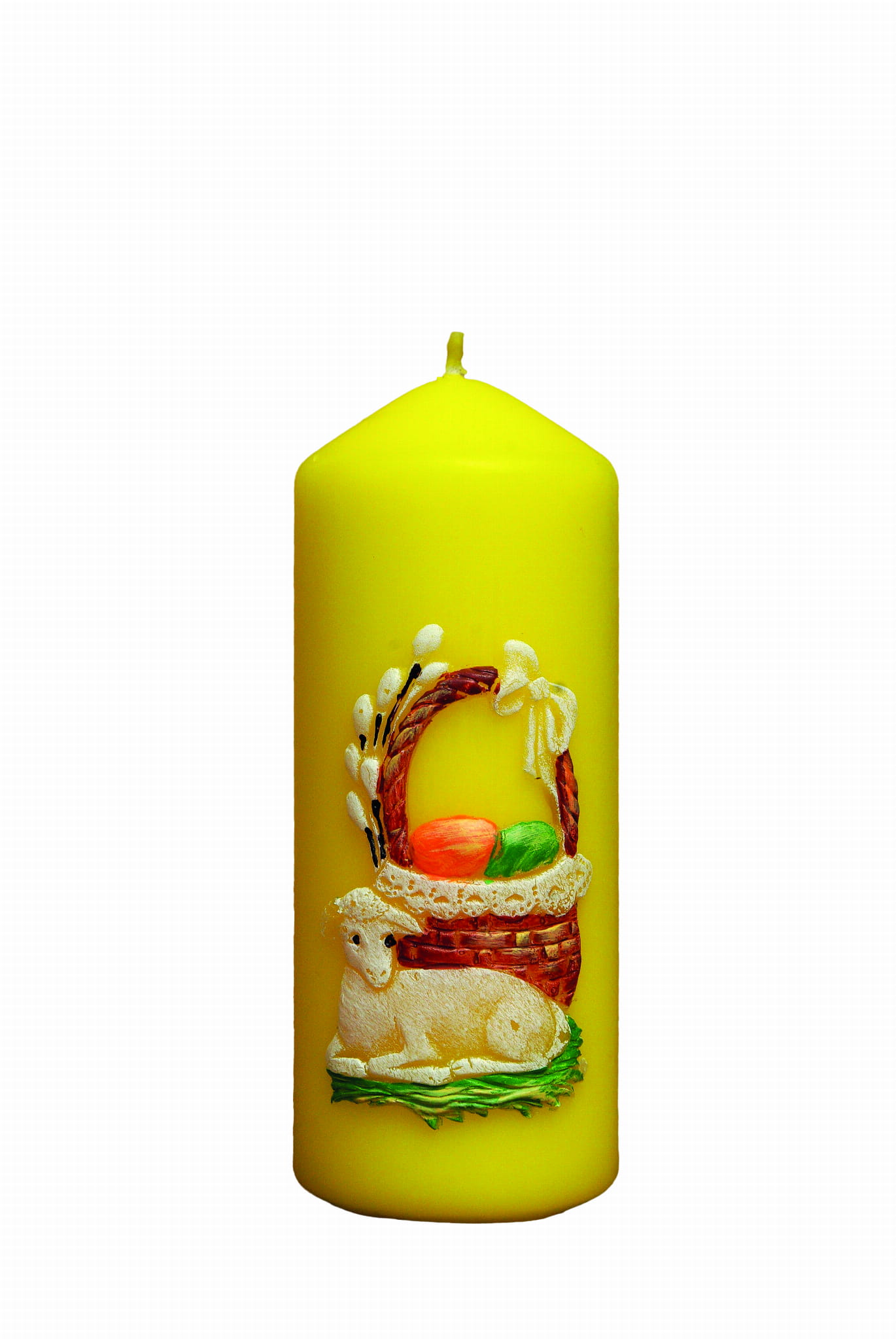 Wspaniałej jakości świeca stworzona na Wielkanoc. Produkt bogato zdobiony aplikacją z wizerunkiem Baranka Bożego.