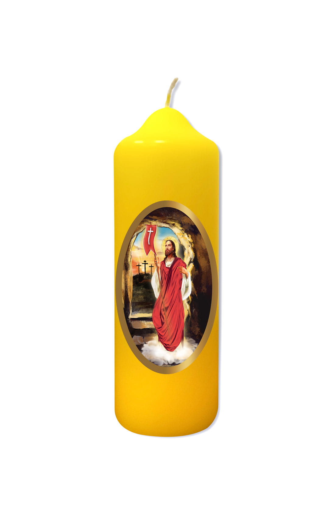 Wspaniałej jakości świeca stworzona na Wielkanoc. Produkt bogato zdobiony naklejką w złotej ramce z wizerunkiem Jezusa Zmartwychwstałego.