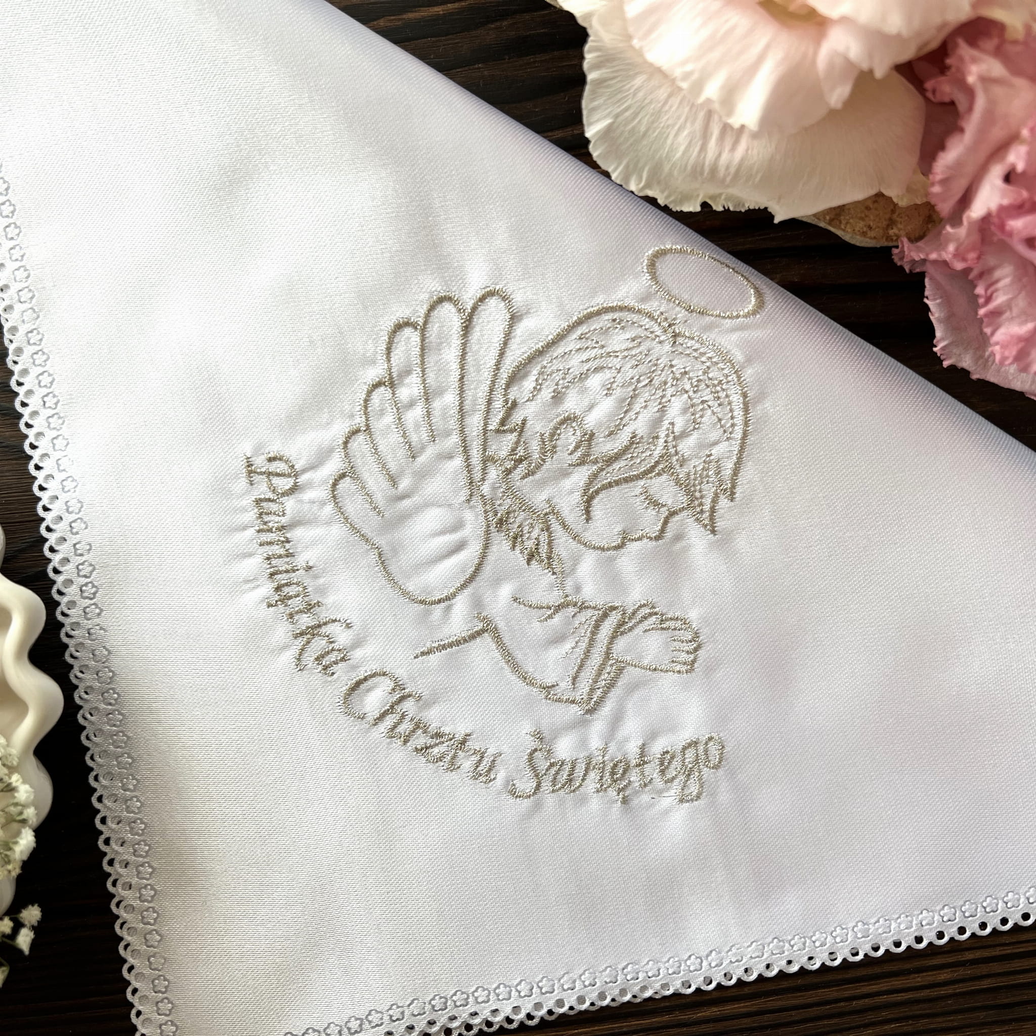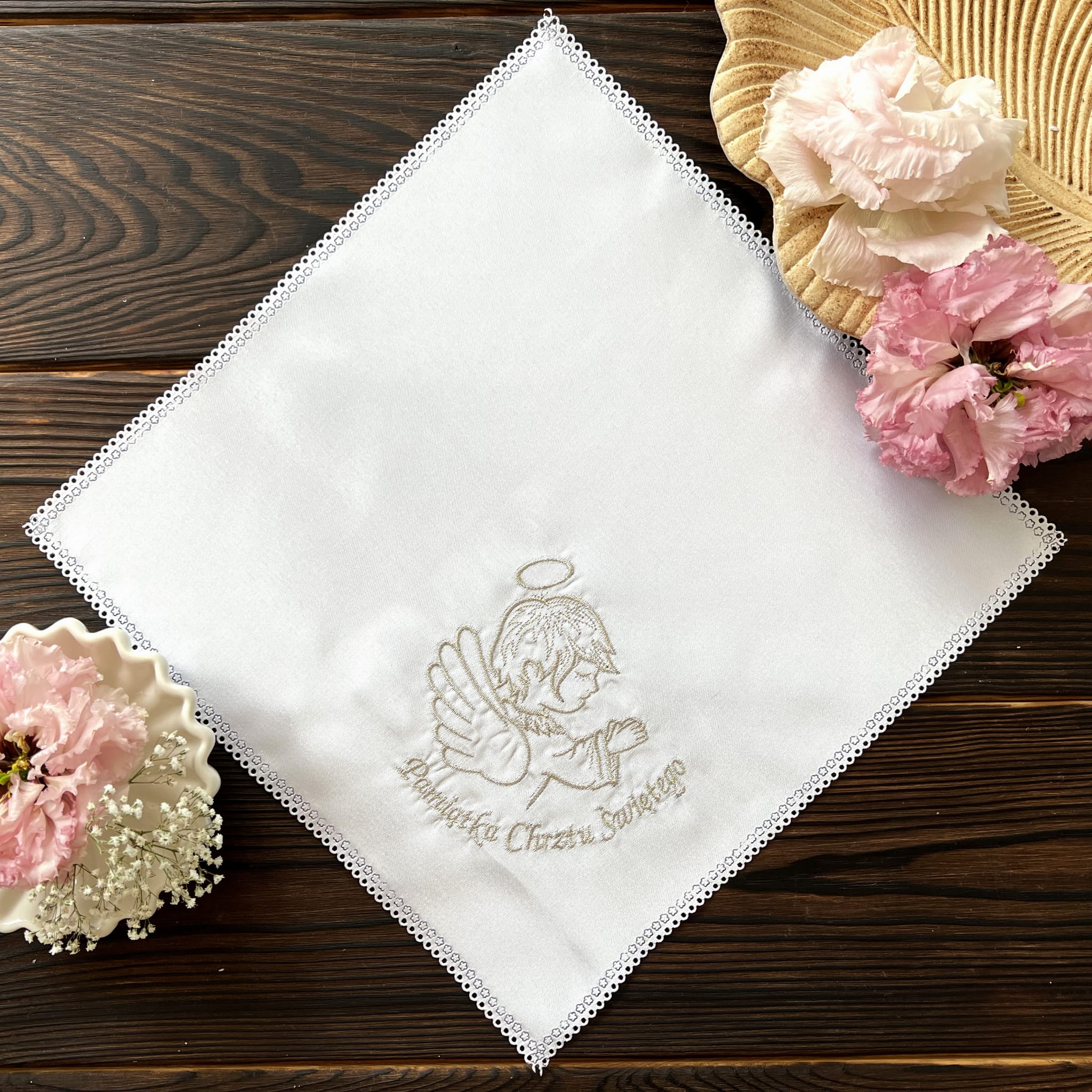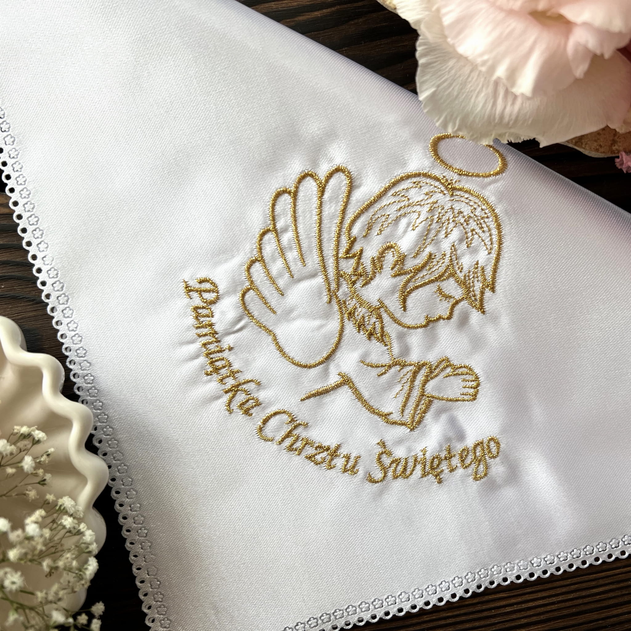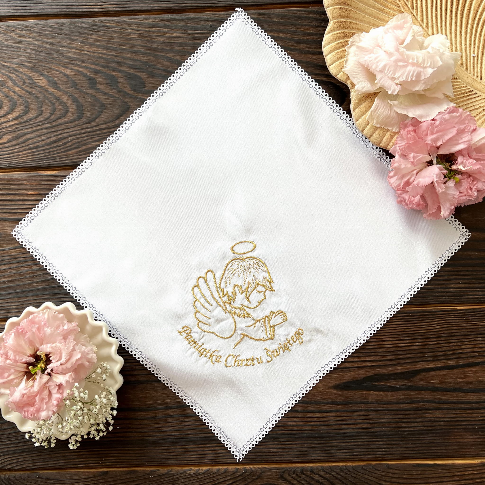 Szatka na Chrzest Święty to elegancki i starannie wykonany produkt. Wykonana z atłasu, który nadaje jej luksusowy wygląd. Haftowany srebrną lub złotą nicią napis Pamiątka Chrztu Świętego, dodaje jej wyjątkowego charakteru. Na szatce umieszczony wyhaftowany modlący się Aniołek. Wysokość i szerokość wynoszą 26 cm, co sprawia, że jest odpowiednia dla niemowląt. Produkt został wyprodukowany w Polsce, co gwarantuje doskonałą jakość i dbałość o detale. Idealna pamiątka na ceremonię Chrztu Świętego dla chłopca i dziewczynki.