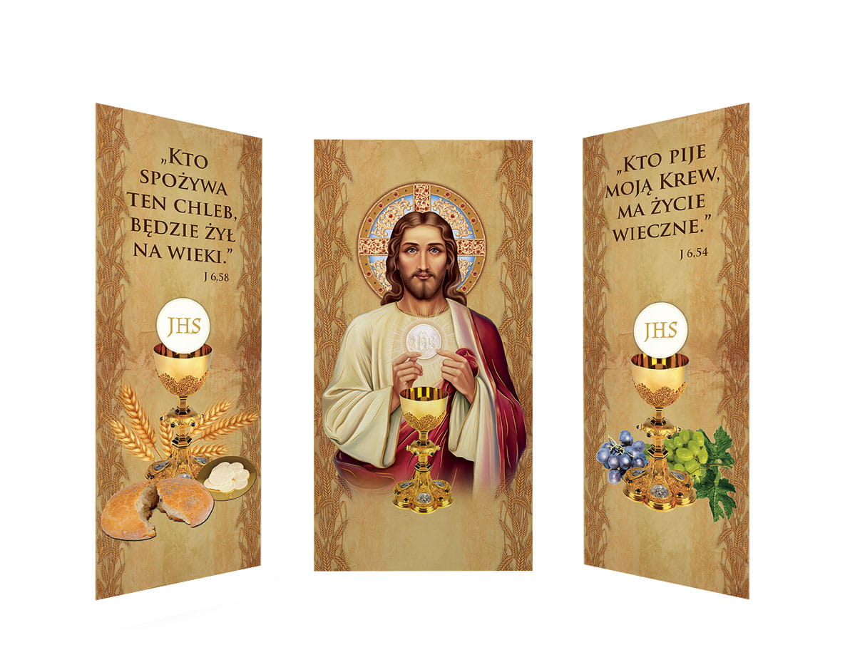 Wysokiej jakości kompozycja banerów na Boże Ciało. Grafika znajdująca się na produktach charakteryzuje się ciepłym odcieniem, który idealnie uświetni uroczystość Bożego Ciała.