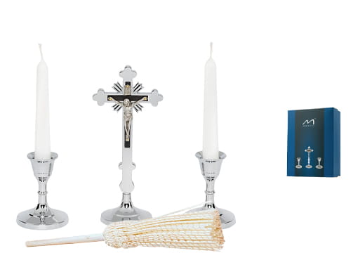 Powyższy produkt to wysokiej jakości komplet kolędowy złożony z Krzyża oraz dwóch świeczników i świec. Komplet kolędowy jest w kolorze srebrnym. Coroczna wizyta duszpasterska to okazja podczas której taki zestaw będzie niezbędnym elementem. Krzyż znajdujący się w komplecie cechuje się gładką, miłą w dotyku powierzchnią, która wspaniale połyskuje pod wpływem światła. Świeczniki utrzymane są w subtelnej, delikatnej formie, idealnie komponującej się z Krzyżem. Komplet kolędowy bardzo dobrze sprawdzi się podczas wizyty duszpasterskiej, ponadto wspaniale będzie komponował się z każdym wnętrzem.