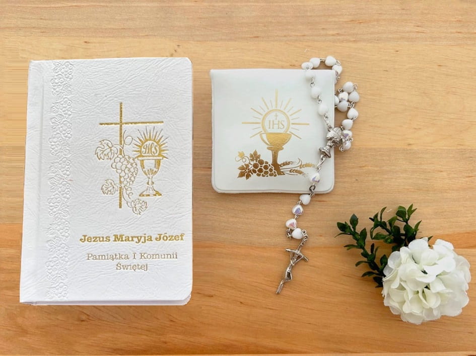 Świętuj Pierwszą Komunię Świętą z naszym eleganckim zestawem, który zawiera książeczkę, różaniec i etui.