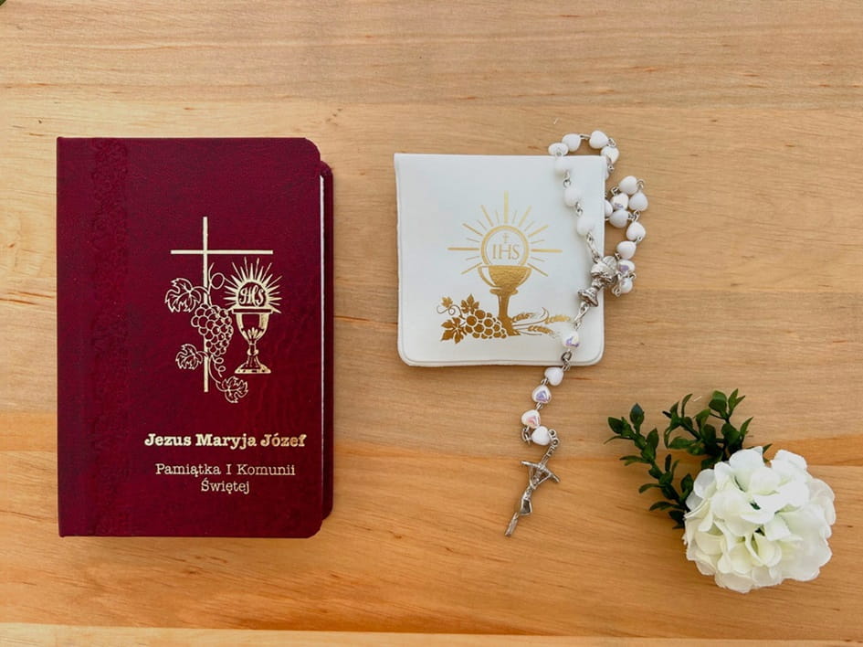 Świętuj Pierwszą Komunię Świętą z naszym eleganckim zestawem, który zawiera książeczkę, różaniec i etui.
