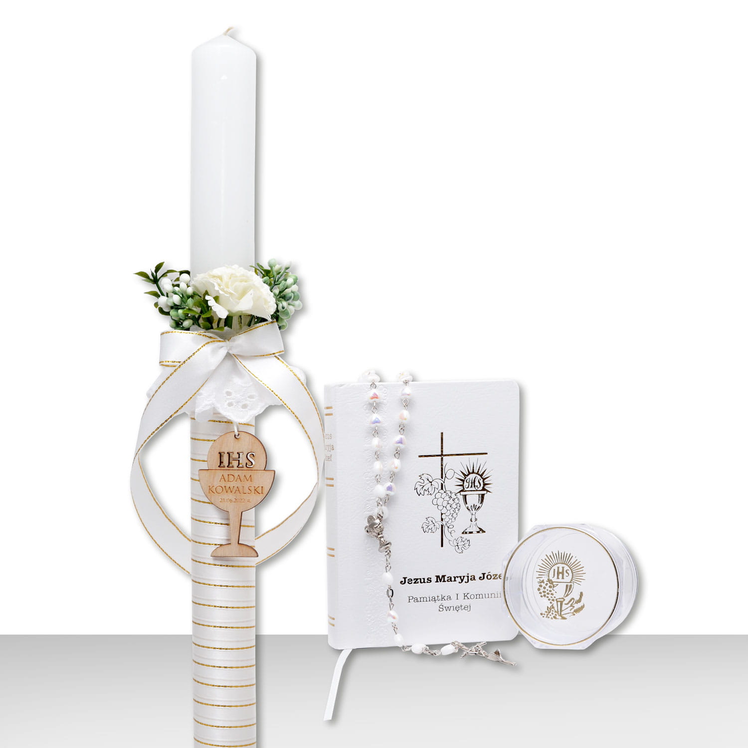 Zestaw na Pierwszą Komunię - świeca personalizowana, różaniec w pudełku i modlitewnik, okapnik GRATIS