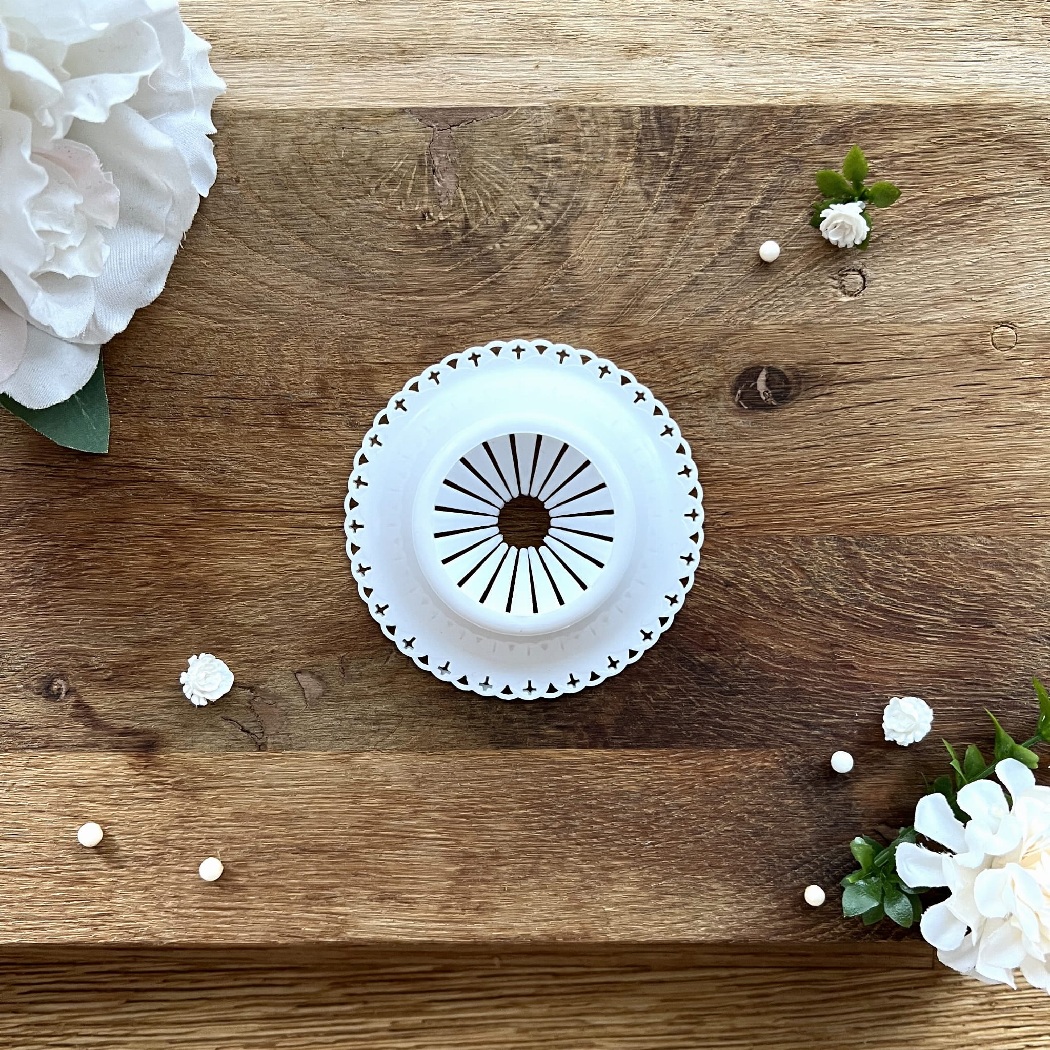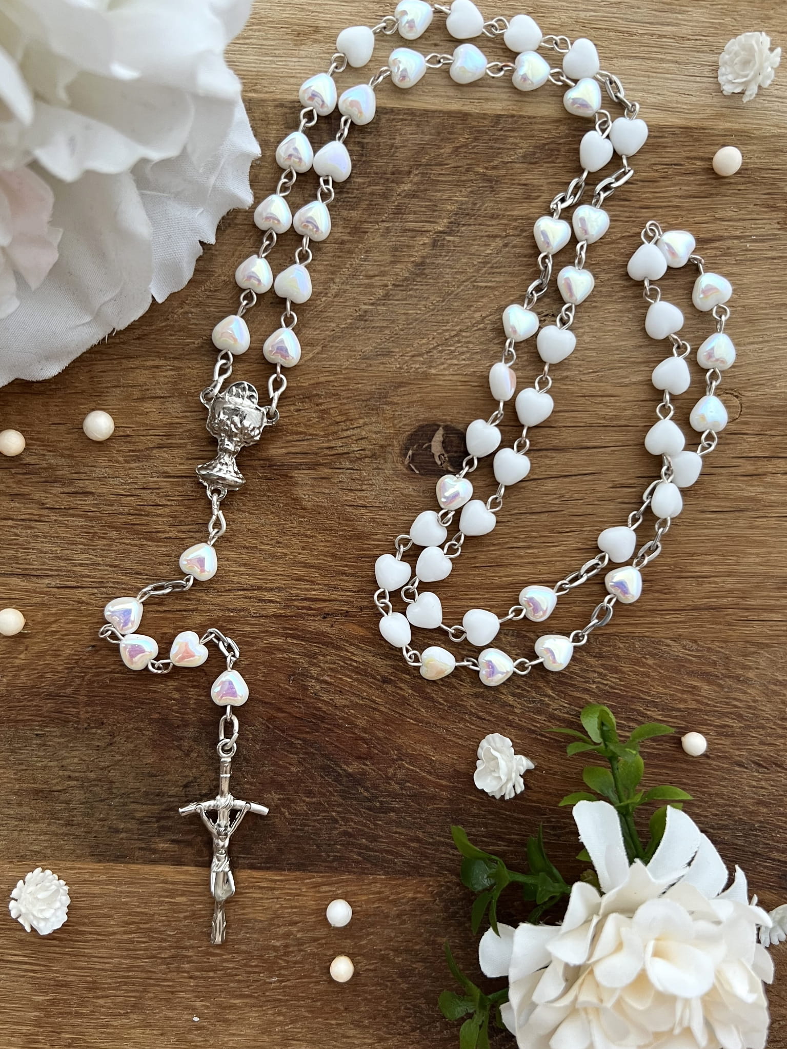 - różaniec w kształcie serduszka, białe - opalizowane. Średnica paciorków: 6 mm.