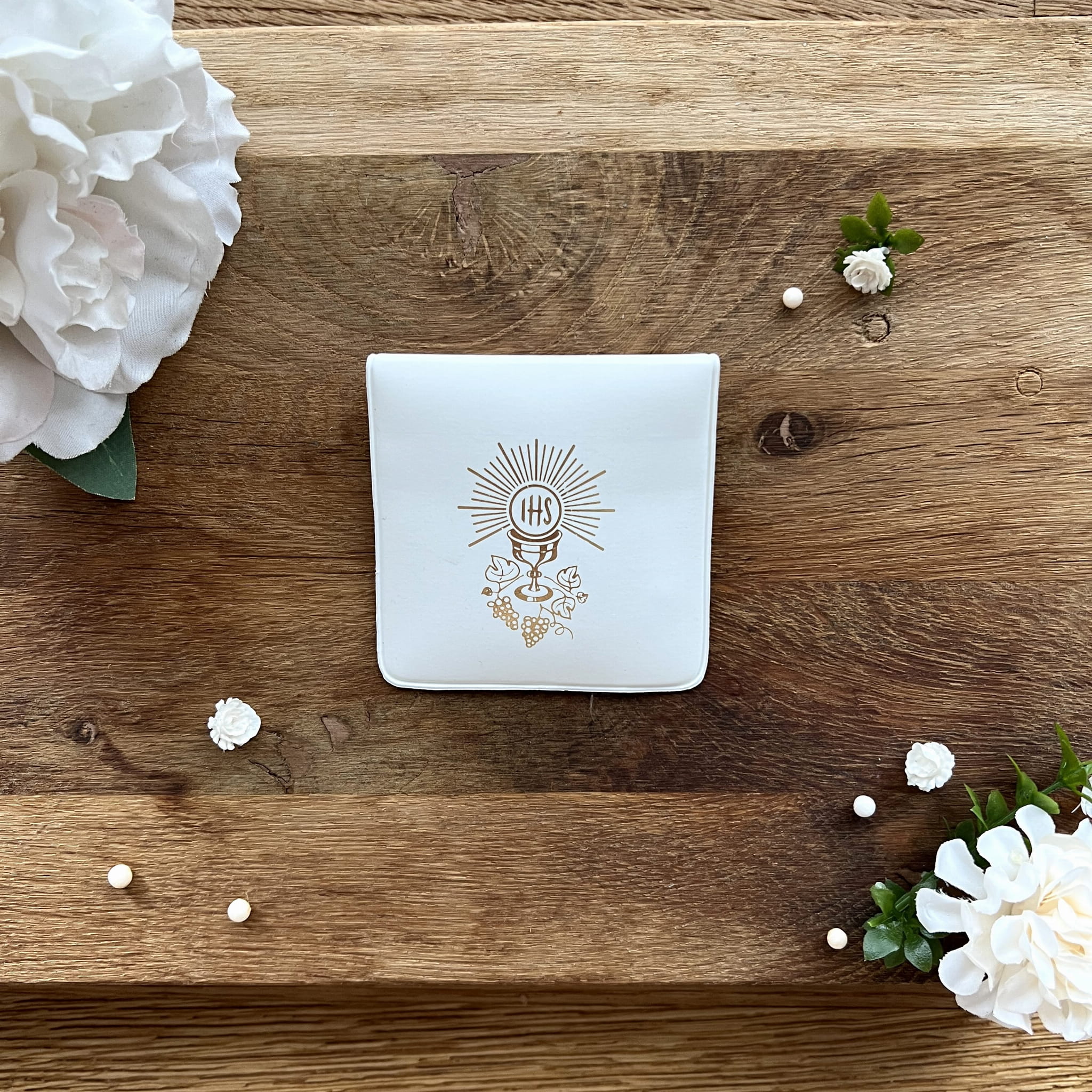 - świeca personalizowana - ręcznie zdobiona subtelnymi dodatkami. Przy białej profitce piękne kwiatuszki oraz drewniany symbol IHS kielich na którym są wygrawerowane dane dziecka pierwszokomunijnego i data komunii. Rozmiar: dł.37cm, śr.3,1cm